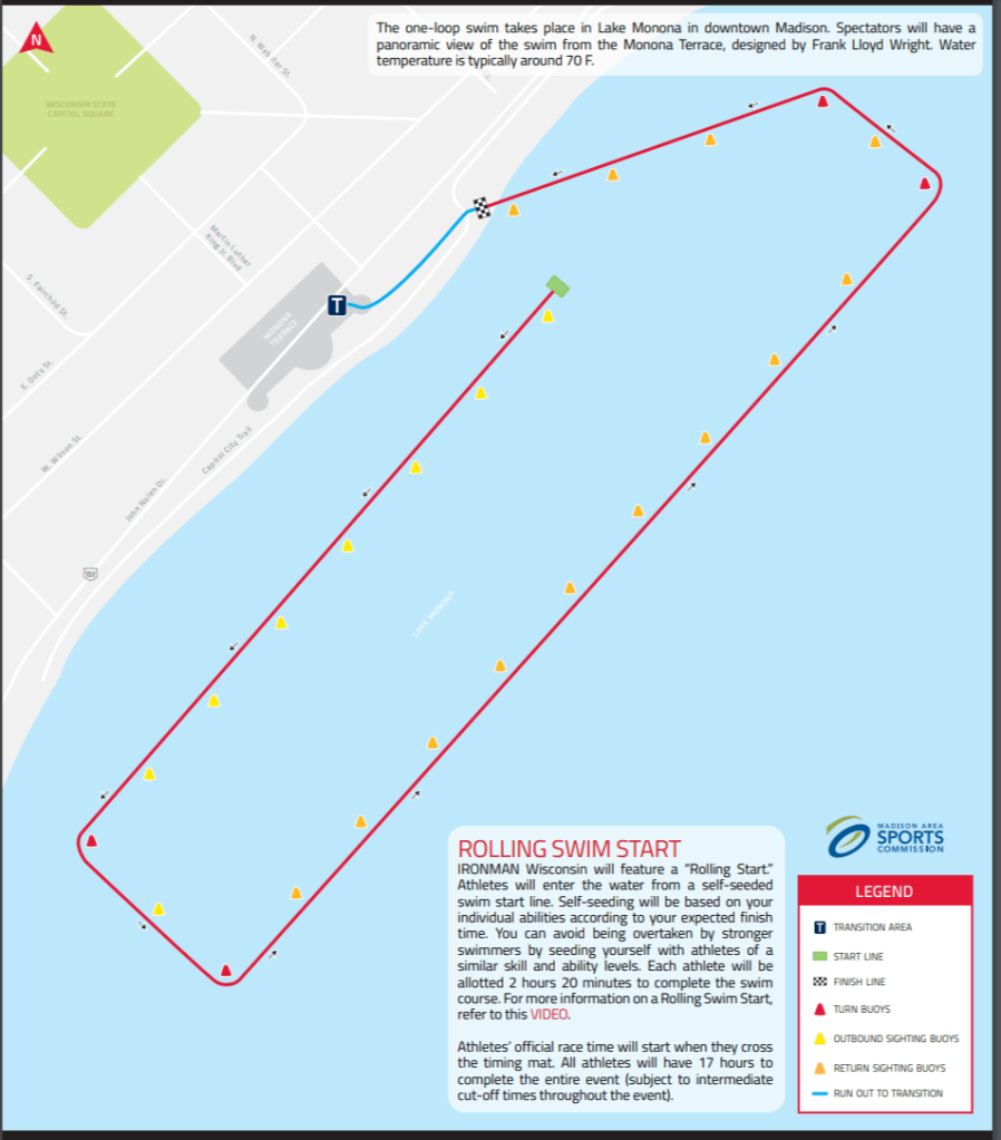 The swim is a one-loop, out and back experience, with turns always on your left. The first stretch hugs the shore along Madison out to the first red buoy, which didn’t feel too bad, considering the waves were pushing me more into shore and a bit on my back. I did drift significantly to the right away from the buoys and had to swim back, which was challenging. I didn’t have as much contact as last time and felt better about the swimming experience on the way out. Here is a shot of the course from the athlete briefing.