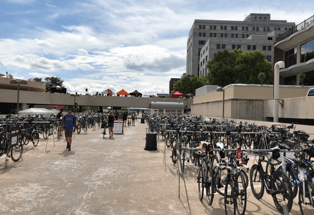 I remembered NOT to bring my pump to the rack, since there are so many pumps available on race-day. A good number of people bring pumps and then there are a lot of “shared use” pumps available. The Trek people also pump up tires on race-day for you if you ask them. Here is a shot at the whole bike setup, on top of the parking garage, next to transition.
