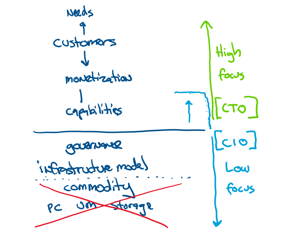 So, where does this leave the corp IT organization? Does it still have a purpose and how does it shift to address the new demands and concerns? The corp IT organization is needing to change from addressing needs of non-commoditized infrastructure deliverables which are heavily siloed, to focusing on cloud multi-capability skills and cloud enablement. This is in conjunction with roles that CIO / CTO tend to fulfill within the organization. If you look at that shift in terms of functions vs. actual positions in a company (understanding sometimes one person holds both responsibilities). You’ll notice in the graphic below the move toward “high focus” activities in the CTO org (or function) which is driving product revenue or employee engagement vs. focused on base delivery. You can also see the struggling place of the corp IT organization, but as we’ll discuss, still having a very relevant place in the picture: