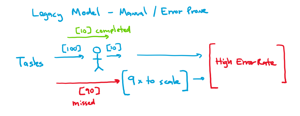 The difference between commodity RPA and non is the opportunity to enable every business user to optimize their own processes, or those of their teams. Non-commodity looks at automation as a project that requires allocation and large effort to complete. Commodity looks at a problem and leverages organic human ingenuity by bringing the problem closer to the person able to solve it. This is why we’re seeing incredible growth of Power Platform across a wide set of industries. Think of it as a force multiplier… in the image below you see a process with high error rate, not automated… replaced by one with automation and low error rate. This takes less people to do more work AND takes advantage of human ingenuity vs. making people slaves to dumb processes. I was talking with a professor about the idea that the 1st, 2nd, and partially the 3rd industrial revolutions served to make humanity an input into a manufacturing process and remove the craftsmanship and ingenuity from whole generations of people, in service of high production. The 4th industrial revolution reverses that trend… by returning creativity to the workforce and moving more repeatable tasks to machines, while creativity and invention return. What if I could enable a model like this and help people to find meaning in creative work?