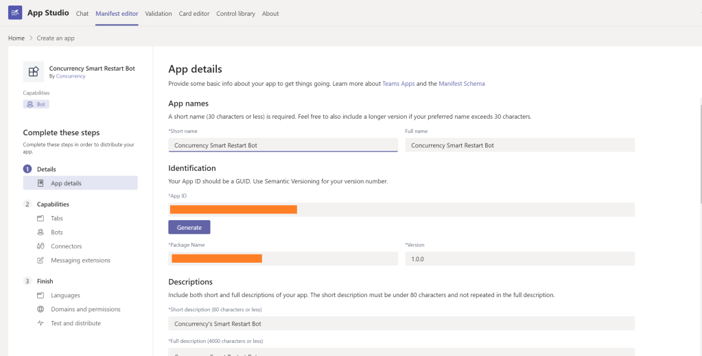 Create a new App in the Manifest Editor, follow the prompts and complete the various fields tied to your bot.