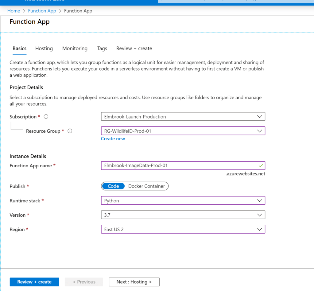 Fill in the function details and use our already created resource group. Ensure you create this as Python so it has the correct runtime stack.