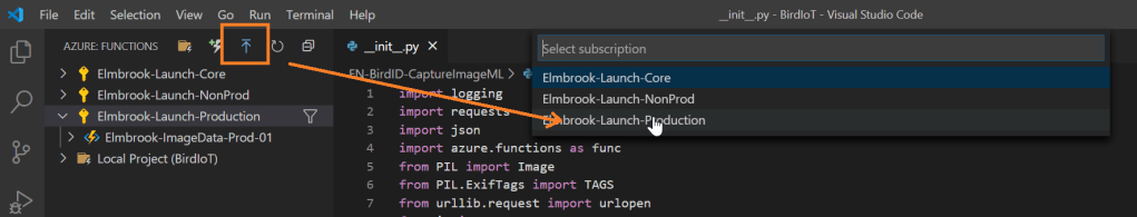 Sign in to your Azure Account, then select the up arrow to deploy, selecting your Azure Function as the deployment target:
