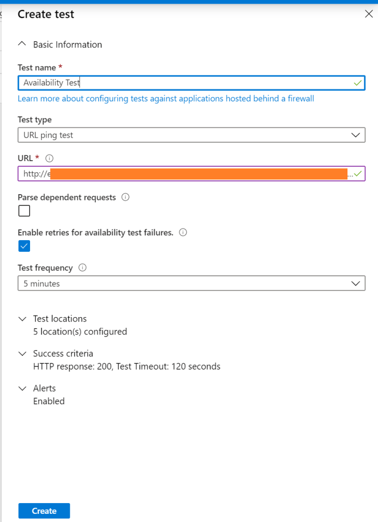 Put in the successful test we did above into your availability test, set to run every 5 minutes. Click “create”.