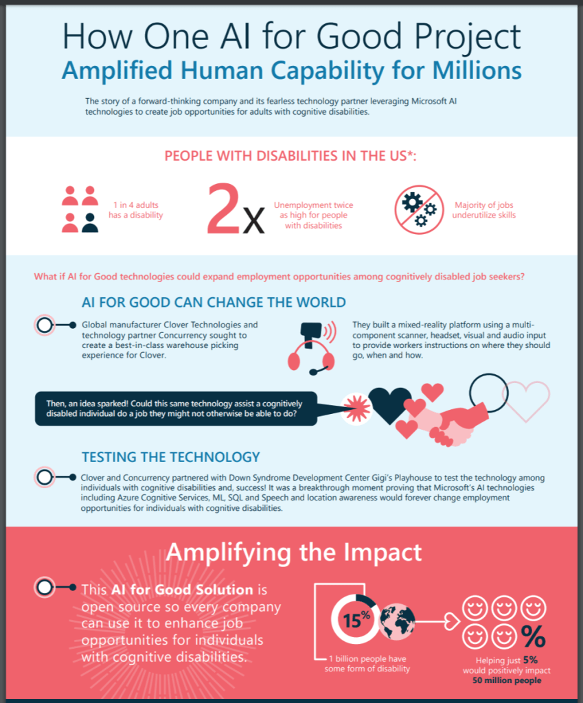 Let’s talk about a story from Gigi’s Playhouse. Their mission to educate, inspire, believe in the capability of individuals with downs inspired a mission at a customer of ours. Clover Technologies was interested in making a difference, as well as improving the productivity of their re-manufacturing plants. They thought, what if we could accomplish efficiency, while at the same time enabling a whole set of people who were dis-empowered to do meaningful work because of a cognitive disability? How could we use the mission of our business (Clover) and the mission of Concurrency (Golden Rule) to do something better? That is where we set out on an AI for Good initiative that enabled individuals with cognitive disabilities with augmented reality that enabled them to do meaningful work on a light manufacturing environment. Using a set of audio inputs and directional visualizations an individual with autism or downs can perform picking operations in a manufacturing environment safely. This job could have already been done by these individuals if they were partnered with another individual, but that’s not normally the case. With this technology we’ve enabled those individuals to do a job they previously could not do, or couldn’t do well.