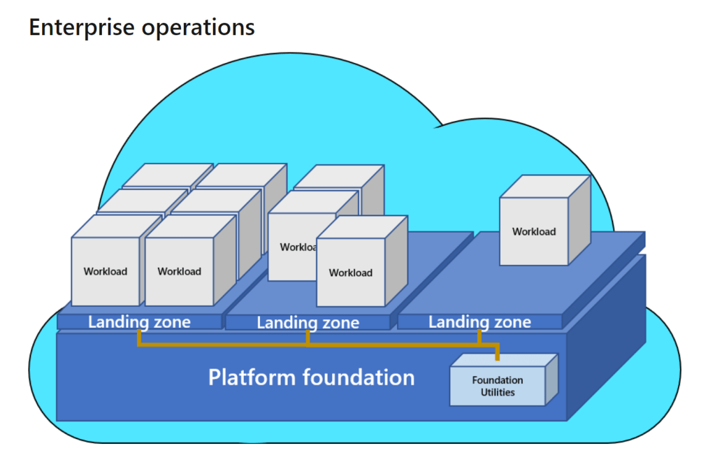 The third option is to form an organization that provides organizational governance but enables the business with the freedom to engage and innovate on the could. This forms an enterprise business standard, with multiple landing zones, scaled to multiple workloads, with distributed authority. It brings the best of the distributed and centralized architectures together and forms an organization that reduces waste while simultaneously encouraging operations excellence. See the CAF image below of the enterprise state.