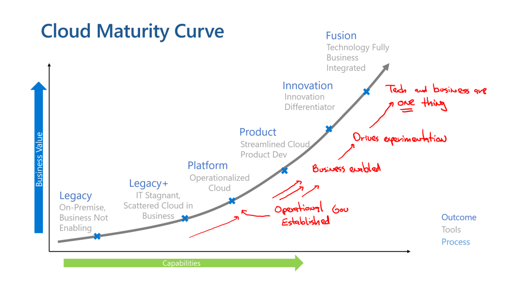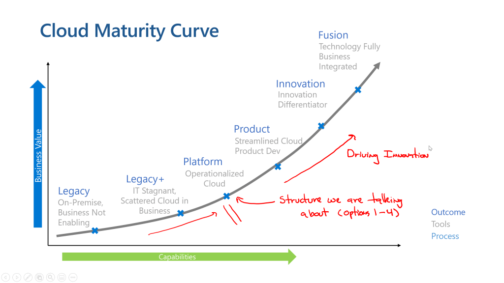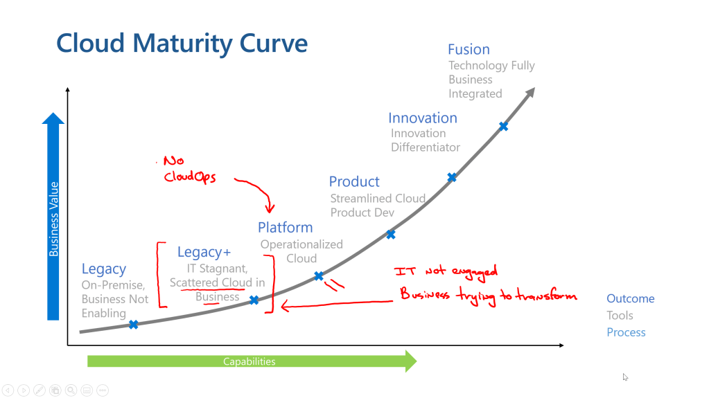 The transition to the cloud represents an opportunity… an opportunity to change the framework of how the traditional IT organization interacts with the business. When I was first starting my career in IT it was untouchable, in the sense that the business didn’t understand what IT did… they just knew that it was important. It was just scary enough that nobody looked behind the curtain. Just keep throwing money at it and it will be fine. For YEARs this model has persisted and as the global consciousness toward technology has become more enlightened, we’ve seen the untouchability of IT waver and die. The business has discovered they have options and that the meager service they were getting from the IT organization isn’t good enough anymore. Any IT organization reading this might say, “this isn’t us” and with that we should realize, “this is EXACTLY us”. The transition from IT provider to technology enabler is a hard one for the IT organization, but no time has been more critical than now. The transition requires an understanding of IT’s traditional failures and the opportunity to move to a better spot in the journey. For this differentiation we’ll leverage the models in the Microsoft Cloud Adoption Framework to discuss the transition. In this case we’ll draw it though for clarity sake.