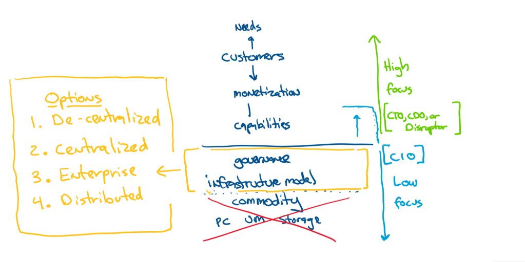 The IT organization needs to move from delivering commodities to engaging the business. In the image below you can see the drop off of legacy services in the IT model and the need to focus more toward governance… lifting into capabilities,In this conversation we’re going to discuss four options that relate to the box below: