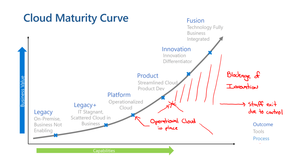 You can see in the maturity curve how this drives the business to not only produce, but to innovate and operate what it creates. It does so however without complete freedom, but with guardrails to keep the business safe. It also establishes a structure without significant compromises.