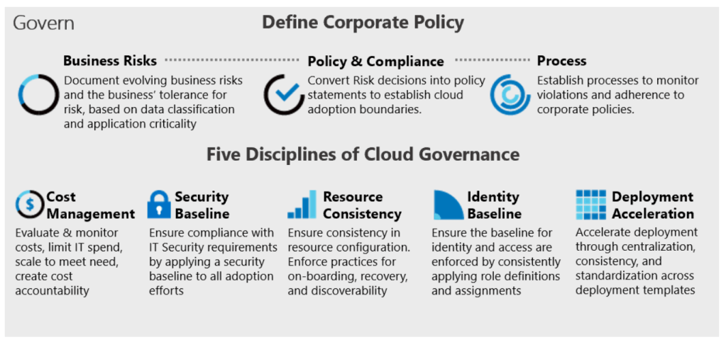 To talk about the five disciplines of cloud governance I’ll turn to the Microsoft Cloud Adoption Framework (CAF) which does a nice job of laying out the things we need to be interested in. They are:
