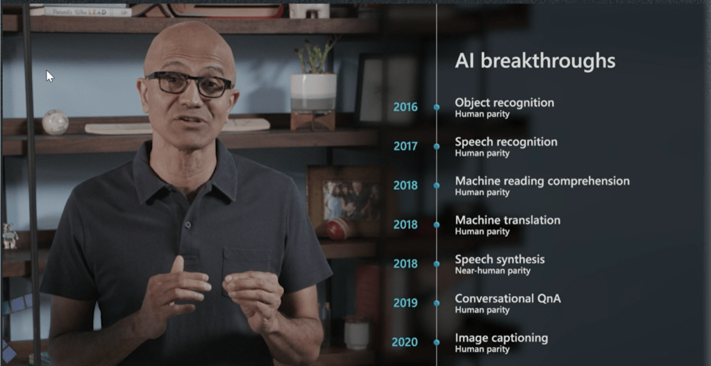 This year at Ignite was a little different in that it was virtual, but it was the same in the increase in capabilities brought from a widely diverse set of areas. Not surprisingly, huge amounts of effort has been placed in advancing Artificial Intelligence capabilities both in commodity AI (Cognitive Services) and custom AL/ML (Azure ML, Databricks, etc.). I appreciated how during the keynote Satya was showed the areas that AI has advanced over the last several years.