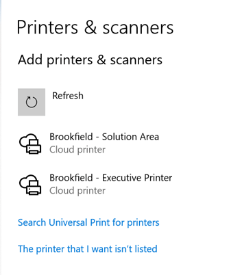 You can see the “search universal print for printers” now showed up. With the refresh, my printers then became available, with no local access, Zero Trust, etc.