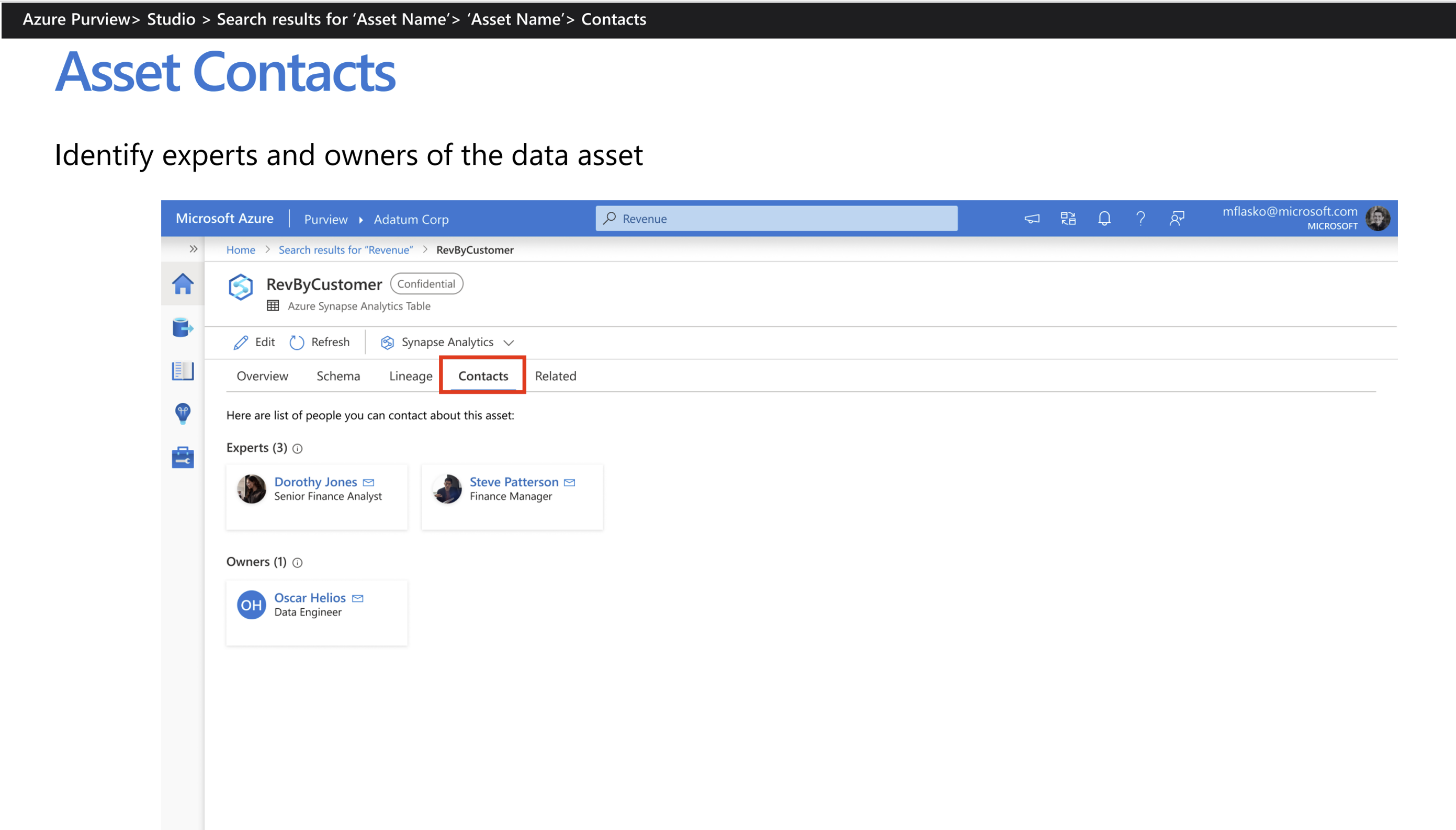 The ability to map an individual from Office 365 as an expert aids discoverability of data for those not familiar with an organizational hierarchy, as well as provides insight into who can make decisions regarding the data’s use and processing.