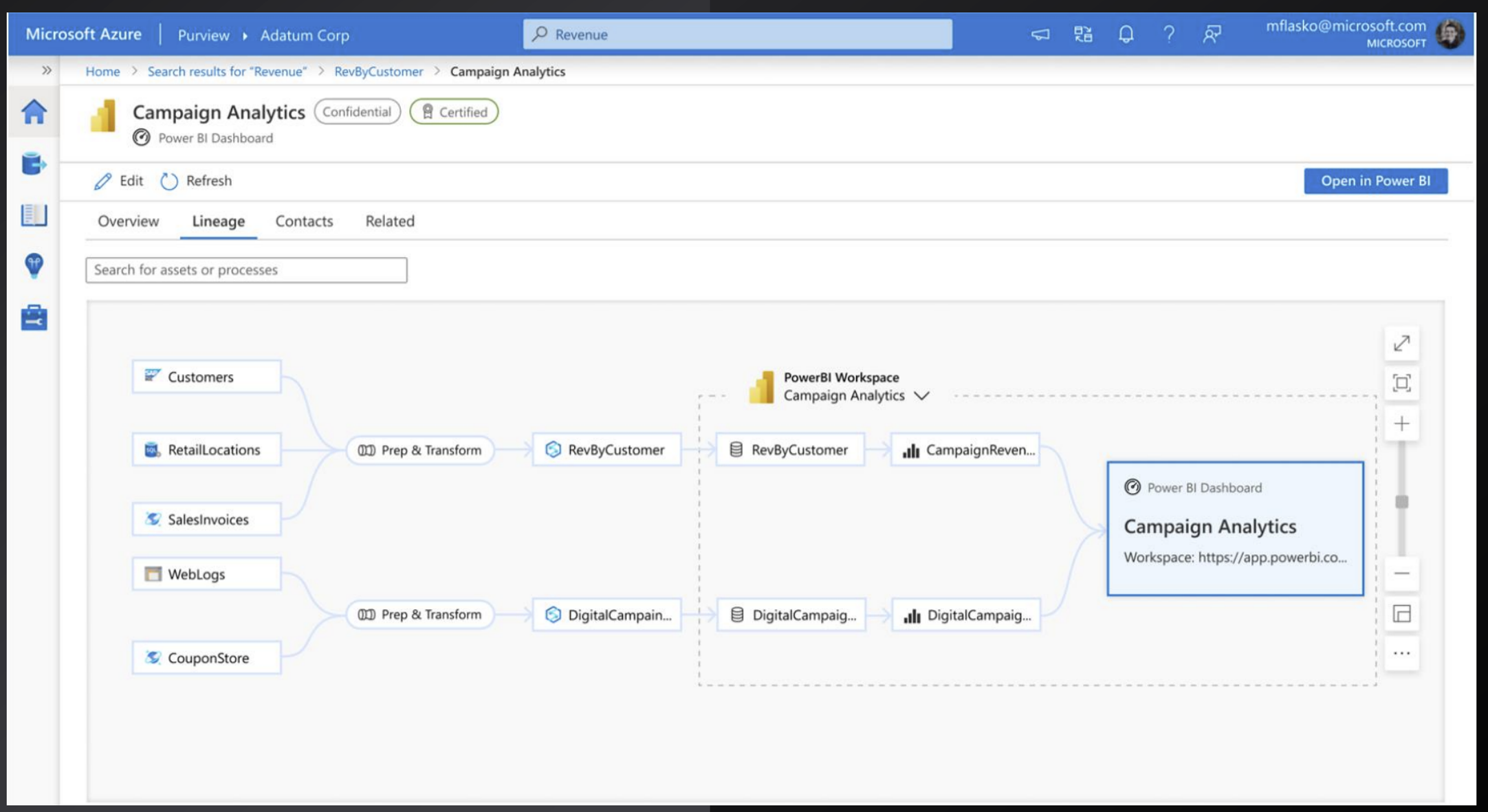 In the example above, you can see the mapping of LastName across several parts of the data estate, allowing an easier time understanding how one data element is used in various capabilities, all the way to Power BI or a data science consumption layer.