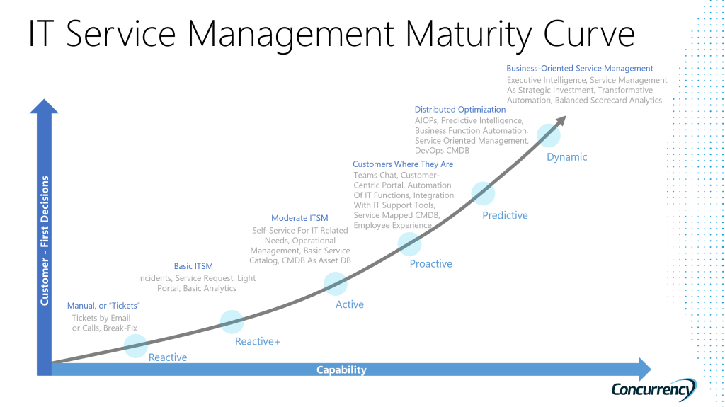 The Proactive maturity level thinks of going out to meet the customers vs. the customers coming to it. They don’t create a service catalog with the purpose of waiting for an ask. The mature proactive IT Service Management is using mechanisms like chat, bots, and seamless device integration to meet the customers where they are. This type of environment focuses on asynchronous communication with customers, rapid responses, and true commoditization of the IT function to the customer.