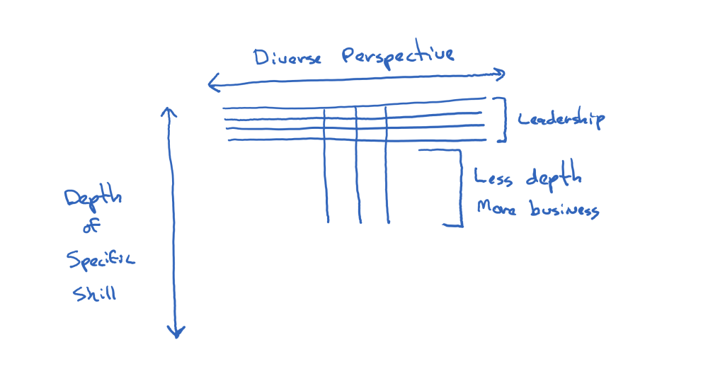 Another take on the T-Shaped career is the move that many leaders choose. As a person enters into leadership the depth of a particular skill is less important than the development of horizontal domains. Rather than extend the horizontal bar out to infinity, I prefer to think of it as broadening the thickness of the horizontal bar and developing capabilities as a leader through ideas, mentorship, curiosity, virtue, and perspective. Many “leadership tracks” inside companies focus on giving additional organizational vision by exposing the individual to different business functions, such as a supply line, manufacturing, human capital, or sales. The goal of leadership development is to create a “well rounded” person, but further than that is the individual’s virtue and how they treat those around them. The term, “what got you here might not get you there”. The skills that helped someone succeed at developing a depth skill or initial levels of leadership might not work later on. See the diagram below which articulates this.