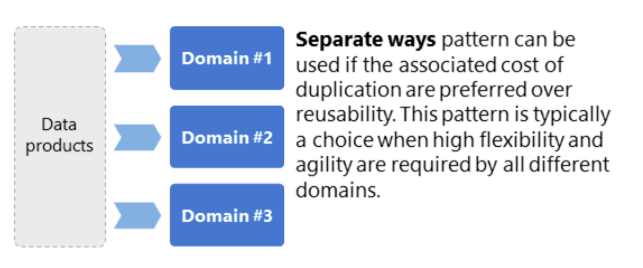 The Separate Ways pattern assumes that data does not cross-over and data is entirely owned by the domain. This is common in organizations with highly focused sub-organizations that have little overlap and little need for sharing. The domain contains the entirety of its certified dataset and does not share the data with other domains, at least not in a structured way.