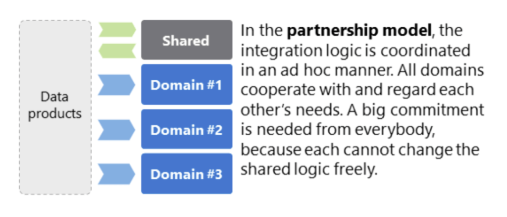 The Partnership Model is where individual domains collaborate to create a loosely coupled shared-domain data partnership where both work against one data product. In order for this to work the domains need to work together in a coordinated fashion and collectively prioritize each’s needs. This might be used when several domains are doing common work, but don’t want to duplicate the data because of cost or upfront activities tied to the initial build.
