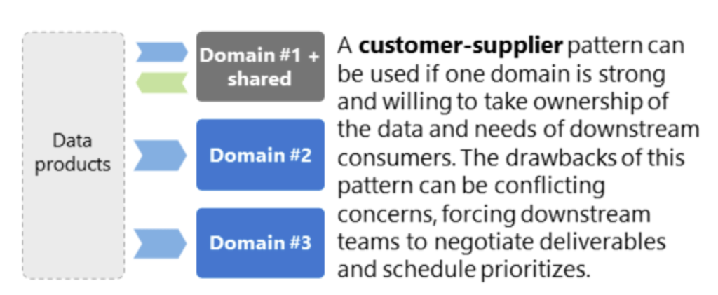 The Customer-Supplier model is one of the most common in a Data Mesh. This model strictly defines the source dataset and owner, then causes downstream consumers to leverage data from that source. In this model the owner is a dependency, but also a point of prioritization and standardization of the data. The downstream consumers leverage the data, potentially duplicating parts of it but the lineage is clear from consumer to source.