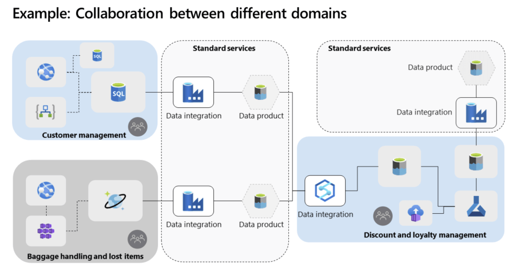 The overall architecture often looks like the following, where each domain delivers something of its own, then sends data to other domains as necessary, creating some duplication, but clear lineage and ability to innovate (source CAF):