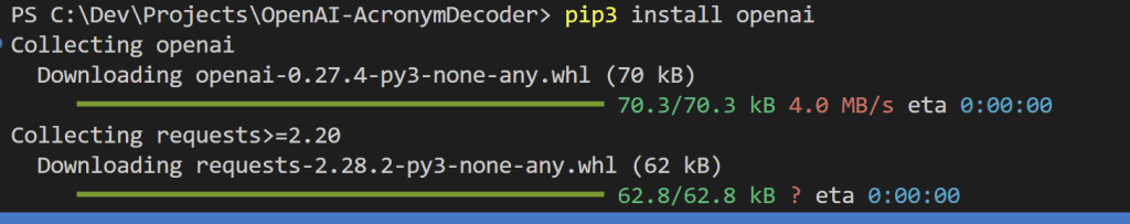 Looking to get started on Open AI in Visual Studio Code but getting the error: “No module named ‘openai'”? Thankfully this is a pretty easy resolution. This is easily resolved by running “pip install openai”