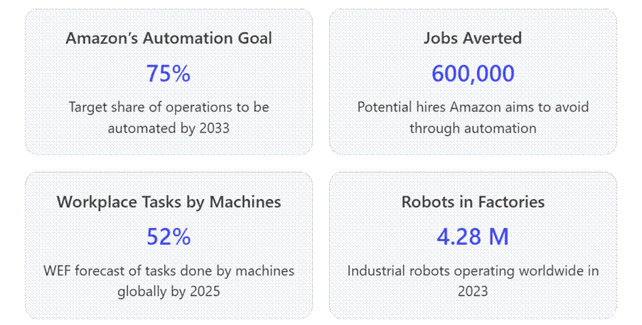 (Sources: Amazon automation report [29] [30]; IFR robotics data; WEF/NYTimes on healthcare robots [31] [32]; Deloitte on RPA in finance [33] [34]; WEF Future of Jobs report [35].)