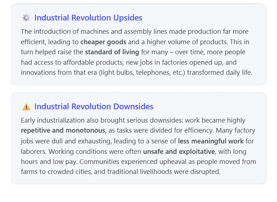 History offers a guide for navigating this workforce transformation. The Industrial Revolution (18th–19th centuries) was the last time we saw such a dramatic shift in work. Back then, mechanization and factory systems brought immense productivity gains and societal changes. We can draw parallels and also learn from the mistakes of that era to avoid repeating them.