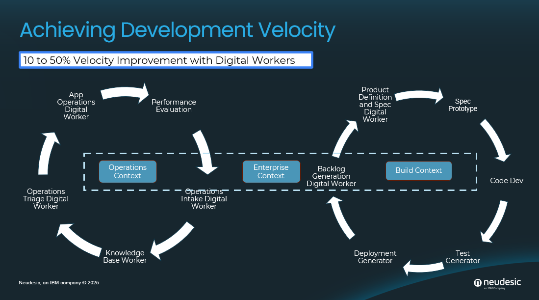 The following diagram shows where Digital Workers can live across the requirements-context-build-and operations lifecycle, and how they work together: